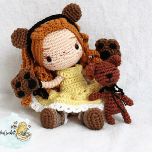 4,50 €Step into the world of fairytales with Goldilocks and her little teddy bear! This charming crochet pattern lets you create the classic character with two interchangeable outfits—her signature dress or an adorable bear costume with ears, tail, and paw gloves.